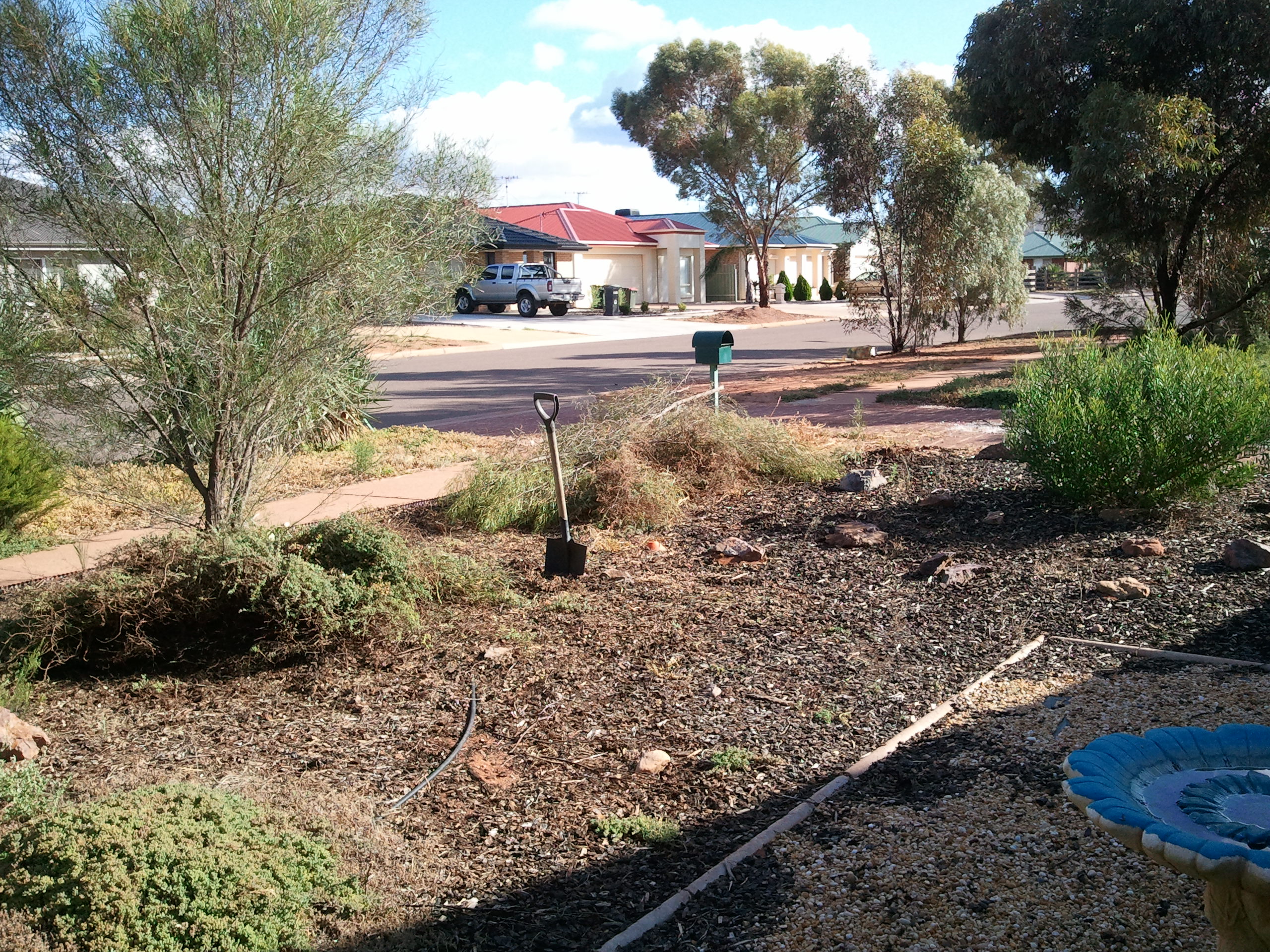 I didn’t get what I wanted in Port Augusta and I did visit the Augusta Garden Centre on the way back out. I didn’t get anything there either but I liked the idea they have of selling the red chips in bags as well as in bulk. I suppose some would say it was a wasted trip but I don’t see it like that – it was a lovely day for a drive, 34c, the roads were clear an I had a good drive there and back and an enjoyable few hours away from Whyalla – that has to be good. At the moment I am stuck until I get assistance to move the rocks from the front so I can get the trailer in and get the black bark lifted. I would do some digging, but at 41c. it’s a tad warm too warm to be swinging a socking great sledgehammer..
