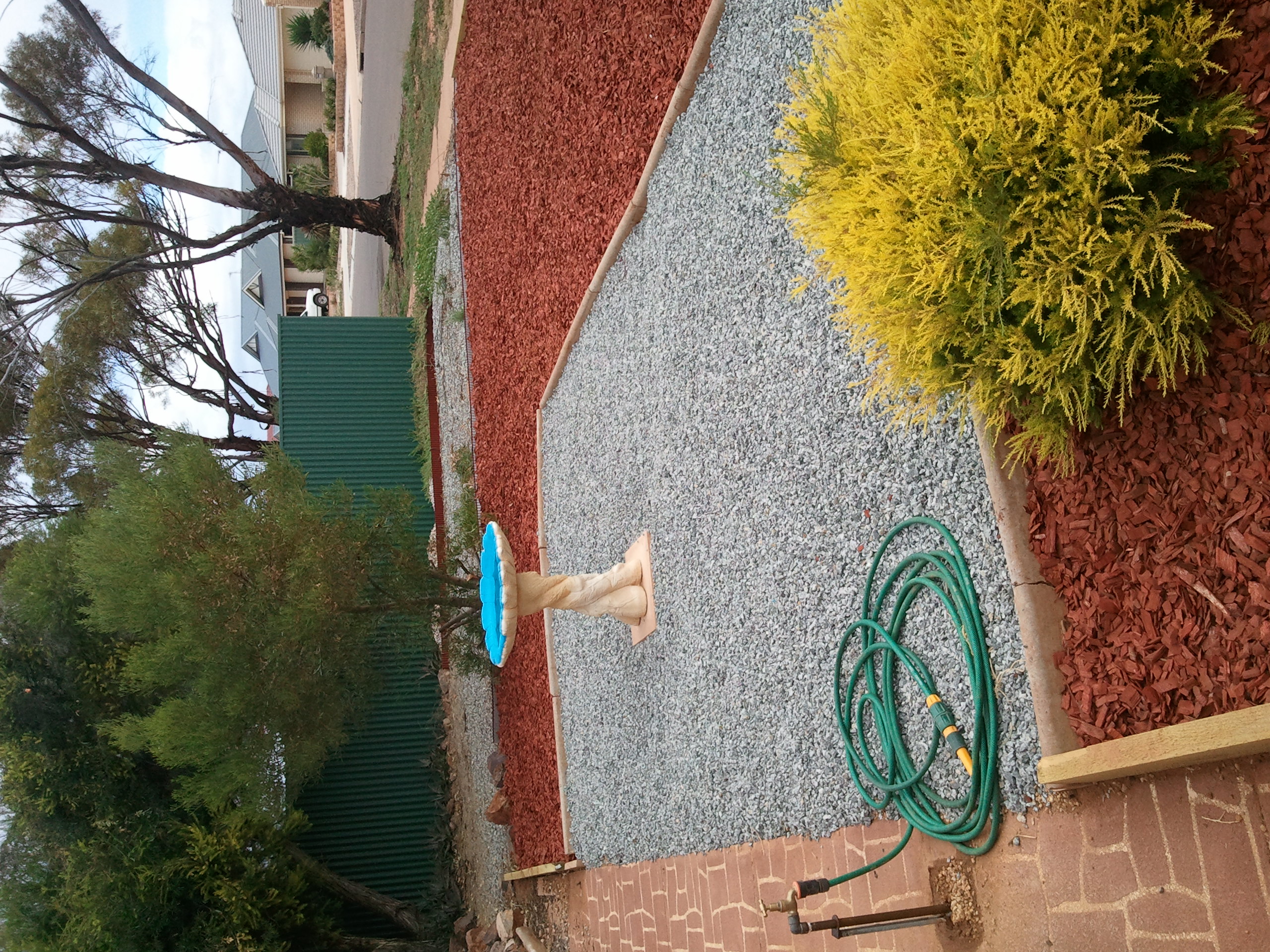 I am glad to say that the two sections of the front and the centre section of the driveway are now completed. It was hard work and even although the wood chip was nowhere nearly as hard to move as the granite, it’s still constant turning and bending. I think I have pulled something on my back but the hard work is done and I dare say my back will will settle down in the fullness of time. The wood chips were delivered at 8:15 and I stared work right away. It took me most of the day to move them and spread the material out to a reasonable depth. I think I probably spread it slightly deeper than the sand yard calculated so I ran out of material. I put plastic sheeting over the granite still in the trailer and rushed down to the sand yard to get more wood to finish it off. I would have hated to have left that little bit unfinished until the weekend. I have used two photographs here, the first being how it looked and the second how it looks now. I think there its quite a difference and I am pleased with it. Perhaps not to everyone’s taste, but ok for me. At the two corners I may decide to put in Rose Bushes, but that’s a job for another day. I still have the two small side parts of the driveway to clean out and finish off but I need a break for a few days to give my poor back time to recover from all that exertion I’ve put it through this last few days. Tomorrow, however, is ANZAC Day and a public holiday anyway so I will have a bit of a rest anyway.