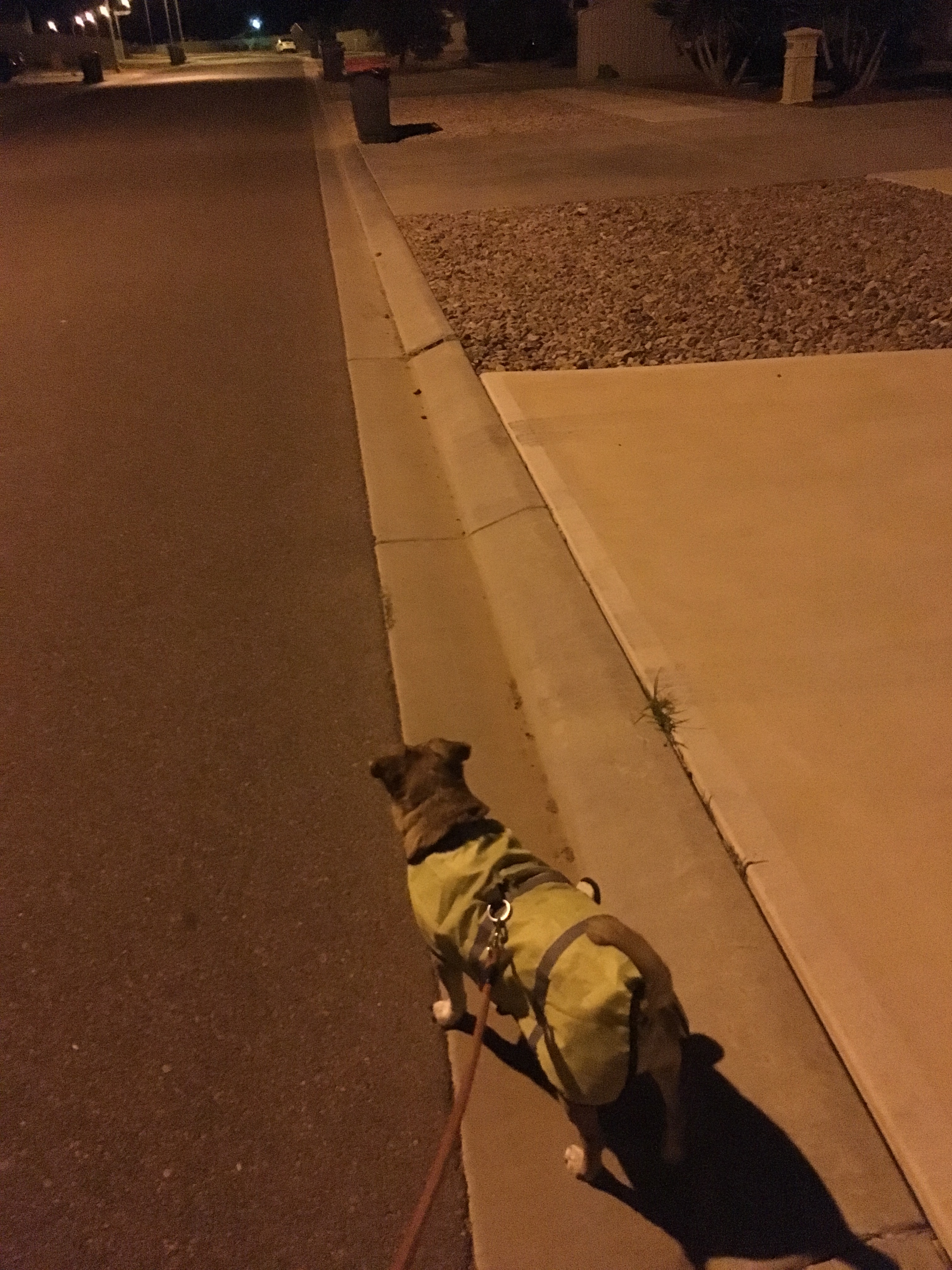 walking and checking the p-mail – except with the gravel area. Age — well I was told he was about 5 when I adopted him and he has been with me for over two years so he’s about 7(ish) – not really old at all.