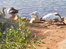 This afternoon- Sunday – we took a walk down to the beach. I didn’t stay there long because I only had a single waste bag with me and the Council have not seen fit to replace the bag dispensers. The area was almost empty. There was a few children in the new play area with parents close beside on benches, but otherwise, not busy at all. As you can see from the photograph that the beach is all but deserted I used the bag I had and decided to drive back to the wetlands. The wetlands has become very popular and the Kiosk was crowded again. I managed to get a place in the car park, got some bags from the dispenser and set off. Like Friday, it was another warm and sunny day – bit cool at times but generally a good day for walking. We did find the birds. I have asked some people who know these things and I am informed that the birds are “Feral Geese, Domestic, Non-Native” No one seems very sure where they came from, but they are there and settled in by the looks of things. Apart from the geese there are Muscovy Ducks and an interesting little bird – black and white with long pink legs – which I discovered are called Black Neck Stilts – apparently native to much of the USA but we do have them here in Australia..
