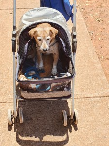 so tired that I lifted him up on my shoulder and carried him the rest of the way. This afternoon I wanted to go for a walk and he came with me. We had not gone far when he really started to slow down. I turned around and came back home. I got the “Dog Stroller” out of the garage, cleaned it and put a thick blanket in there for him to sit on. Lifted him him in, attached the harness and off we went. He loved it, sitting there watching everything around him and still being out with his daddy. Can’t get better than that. ( I have to mention that it is over 34 years since I pushed a pram for any distance and I forgot how tiring it is on the arms) I also took a bottle of water and a collapsible bowl so we could both have a drink. Well, yes, I got some looks from passing motorists, but who cares. Benji was comfortable