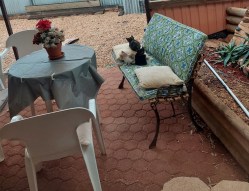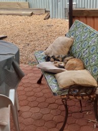 day I wrote that I had somehow acquired cats and then discovered that I also had kittens wandering about. I have found that cats and kittens seem to vanish for much of the day then in the afternoon and for most of the night ( I think) they gather to sleep on the park bench. Still haven’t figured out what the nose rubs between Benji and one of the cats, meant although I have been told by someone