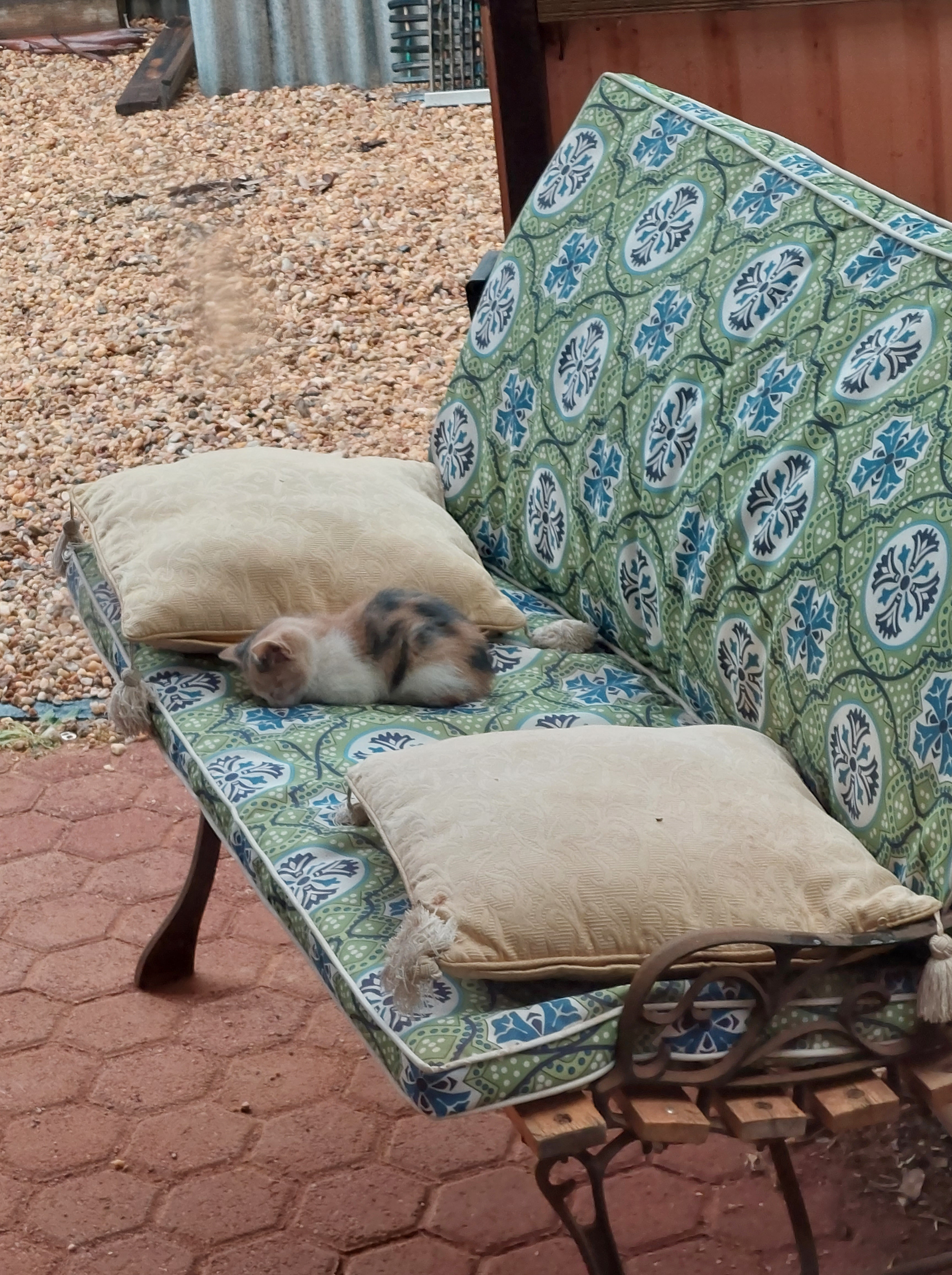 day I wrote that I had somehow acquired cats and then discovered that I also had kittens wandering about. I have found that cats and kittens seem to vanish for much of the day then in the afternoon and for most of the night ( I think) they gather to sleep on the park bench. Still haven’t figured out what the nose rubs between Benji and one of the cats, meant although I have been told by someone
