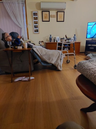The nurse who comes on a Wednesday to assist Annabell to shower came at her usual time of 9am. I have to say that Annabell (and me by default) had a really bad night, and I was up with her most of the night. This has lasted into the day, and she was not able to go through the effort of showering so, she was helped as well as the nurse could and we returned her to her recliner and covered her. It is now well into the afternoon, and she has only just come-to. I had intended to go to the shops