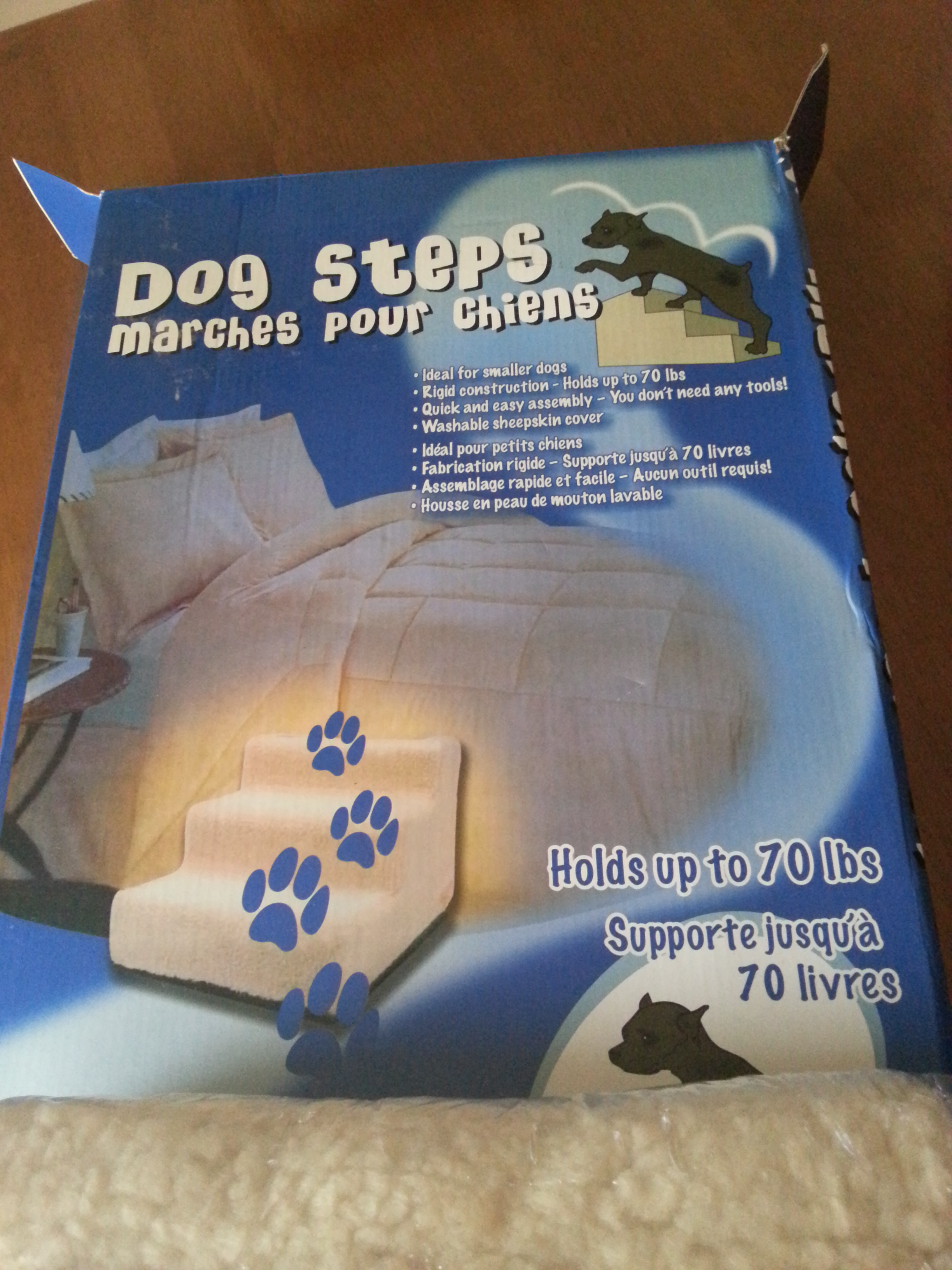 You may remember that I did say that I had ordered Dog Steps for the little man to get up on his bed. They arrived yesterday and I am very impressed. I thought – the description was not all that clear – that they would be some kind of moulded foam, but not so. They are moulded steps that I have to put together and then cover them with a lambswool covering – pretty cool, I thought. And 70 pounds (31.7 kilo)